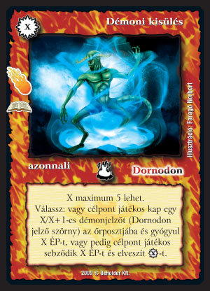 Démoni kisülés (5): Bárhogy próbálkozom, valahogy nem tudom átérezni ezt a lapot. Valószínűleg azért mert nem jó. Hiába konfigurálható, ha egyszer bármennyiért játsszuk is ki, mindig rosszul járunk. Ha lényt és gyógyulást kérünk, akkor kevés VP-ért nagyon felejthető hatás lesz a jutalmunk. Drágábban kirakva pedig óriási a kockázat, ráadásul miért? Egy képesség nélküli gyenge lényért. Direktsebzésként szintén elég gyatra, főleg mert lénybe se lehet lőni.