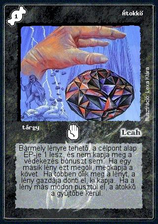 Kiadás: Alappakli, 1. kiadás, Alappakli, 2. kiadás, Alappakli, 3. kiadás, Alappakli, 4. kiadás Gyakoriság: nem gyakori Lapszín (isten): Leah Típus: tárgy Szöveg: Bármely lényre tehető, a célpont alap ÉP-je 1 lesz, és nem kapja meg a védekezés bónuszt sem. Ha egy másik lény ezt megöli, megkapja a követ. Ha többen ölik meg a lényt, a lény gazdája dönti el, ki kapja. Ha a lény más módon pusztul el, a átokkő a gyűjtőbe kerül. Illusztráció: Lexa Klára