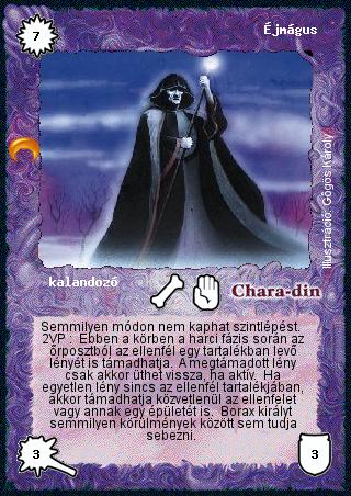 Kiadás: Chara-din visszatér, Védnök 2023 Gyakoriság: ritka Lapszín (isten): Chara-din Típus: kalandozó Szöveg: Semmilyen módon nem kaphat szintlépést. 2VP: Ebben a körben a harci fázis során az őrposztból az ellenfél egy tartalékban levő lényét is támadhatja. A megtámadott lény csak akkor üthet vissza, ha aktív. Ha egyetlen lény sincs az ellenfél tartalékjában, akkor támadhatja közvetlenül az ellenfelet vagy annak egy épületét is. Borax királyt semmilyen körülmények között sem tudja sebezni. Illusztráció: Gőgös Károly