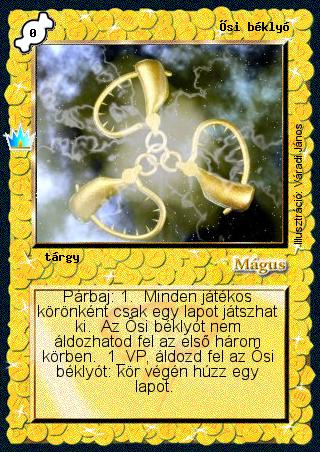 Kiadás: Ősi legendák Gyakoriság: ritka Lapszín (isten): Mágus Klán Típus: tárgy Szöveg: Párbaj: 1. Minden játékos körönként csak egy lapot játszhat ki. Az Ősi béklyót nem áldozhatod fel az első három körben. 1 VP, áldozd fel az Ősi béklyót: kör végén húzz egy lapot. Illusztráció: Váradi János