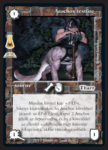 Kiadás: Beloran kisérletei (Zén) Gyakoriság: ritka Lapszín (isten): Tharr Típus: szörny Altípus: - Szöveg: Minden lényed kap +1 ÉP-t. Sikeres kijátszásakor, ha Arochos követővel játszol: az ÉP-d 1 lesz, kapsz 2 Arochos jelzőt az őrposztodba, és ha a követődet az ellenfél szabálylapja vagy követője kikapcsolta, akkor visszakapcsolódik. Illusztráció: Berényi Szabolcs