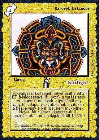 Kiadás: Alappakli, 4. kiadás, Túlélők Földje Gyakoriság: nem gyakori Lapszín (isten): Fairlight Típus: tárgy Szöveg: A kijátszási költséget helyettesítheted 2 ÉP feláldozásával is. Azok a varázslatok és hatások, amelyek a gyűjtőből egy vagy több lapot visszatesznek a játékba, a kézbe vagy a pakliba, nem működnek, kivéve, ha sikeres kijátszásuk ill. használatuk után gazdájuk elkölt 10 VP-t. Szinesítő szöveg: "Az ősök bilincsének szétszakítása még Molgannak is nehezen sikerült." Illusztráció: Lipták László