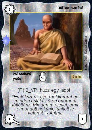 Kiadás: Ezüsthajnal, Túlélők Földje Gyakoriság: gyakori Lapszín (isten): Raia Típus: kalandozó Altípus: gnóm Szöveg: (P),2 VP: húzz egy lapot. Szinesítő szöveg: "Emlékszem, gyermekkoromban minden estét az öreg gnómnál töltöttünk. Minden mesével, amit elmondott nekünk, tanított is valamit." - Aritma Illusztráció: Szász Gábor
