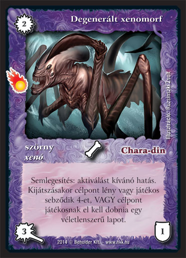 Kiadás: Mágusok Alkonya Gyakoriság: ritka Lapszín (isten): Chara-din Típus: szörny Altípus: xenó Szöveg: Semlegesítés: aktiválást kívánó hatás. Kijátszásakor célpont lény vagy játékos sebződik 4-et, VAGY célpont játékosnak el kell dobnia egy véletlenszerű lapot. Illusztráció: Ruzsinszki Zsolt