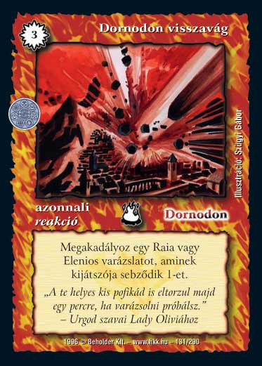 Nem, mivel az Áttérítés a szövege szerint célpont lapra hat, és célpont lap csak már az asztalon levõ lap lehet, a Dornodon visszavág pedig nem ilyen lapra vonatkozik. | | (AK19) A Destabilizátor azokra az azonnali varázslatokra hat, melyek szövegében szerepel a "közvetlenül azután játszhatod ki" szöveg (Az elme fölénye, Ellenvarázslat, Manacsapda, Agybénítás, Manaégés, Dornodon visszavág, Rughar dilemmája, Ő a kegyencem, Azt mondtam, nem (ultraritka)), melyeket közvetlenül az ellenfél húzási fázisa után is ki lehet játszani (Passzivitás, Tudatrombolás, Elzárás), valamint A gyenge erejére és a Negációra, ha ez utóbbi kettőt reakcióként használják. | | (AK23) A mágia létsíkjával a Dornodon visszavág kettőt sebez, mivel A mágia létsíkjánál a sebző általános és azonnali varázslatok eggyel többet sebeznek. Az azonnali reakció varázslatok az azonnali varázslatoknak egy alcsoportja, és minden varázslat, ami akár csak 1 ÉP sebzést is okoz, sebző varázslat. | | (AK23) A Dornodon visszavág tűzvarázslat, csak a tűz ikon lemaradt róla. A tűz síkjánál ezért több VP-be kerül ellenvarázsolni. | | (AK23) A Földanya amulettjével az azonnali reakció lapokat lehet eldobatni. A harmadik kiadástól kezdve lettek megkülönböztetve az azonnali reakció lapok, így ebben a kiadásban már az Agybénításra, Manacsapdára, Az elme fölényére, a Jellemtükörre és a Manaégésre rákerült az, hogy azonnali reakció. Rajtuk kívül azonnali reakció még a Dornodon visszavág (itt nem szerepel ugyan a lapon, de a Chara-din visszatér megjelenésekor még nem volt ilyen varázslatkategória), az Ő a kegyencem és az Azt mondtam, nem. A gyenge ereje és a Negáció csak akkor változik reakció lappá, amikor kijátszásra kerülnek, ezek nem azonnali reakció lapok, tehát nem lehet őket eldobatni. | | (AK71) Az első ilyen dolog az azonnali reakciók időzítése. Régen ez nem volt olyan nagy gond, mivel csak olyan egyszerű reakció lapok léteztek, mint az Ellenvarázslat. Ma már azonban a Majd legközelebb és A hatalom torzulása korában jóval bonyolultabb lett a helyzet. A reakciók használatára vonatkozó szabály a következő: ha valaki kijátszik egy lapot, az ellenfél reagálhat rá egy reakcióval, majd ismét ő reagálhat, illetve ha az ellenfél nem reagált, akkor is reagálhat a saját lapjára. Majd amikor már senki sem akar reagálni, létrejönnek a varázslatok, mégpedig időrendi sorrendben először a legutoljára kijátszott reakció lap, majd az azelőtti, és így tovább.