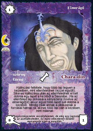 Kiadás: Végzetes utazás (Zén) Gyakoriság: ritka Lapszín (isten): Chara-din Típus: szörny Altípus: féreg Szöveg: Kijátszási feltétele, hogy több lap legyen a kezedben, mint ellenfelednek (ezzel együtt). Sikeres kijátszása után az ellenfelednek el kell dobnia egy lapot a kezéből a Semmibe. Ha az ellenfeled lap dobására kényszerül (kivéve az elmerágótól) akkor egyel több lapot kell dobnia a kezéből. Mindig csak annak a játékosnak a forrásai hatnak rá, akinek több lap van a kezében, mint másnak. Szinesítő szöveg: "Az egészségesekre veszélytelenek, de elég egy karcolás az asztráltesteden, és máris elkezdenek belülről marcangolni ezek a paraziták." Illusztráció: Mayer László