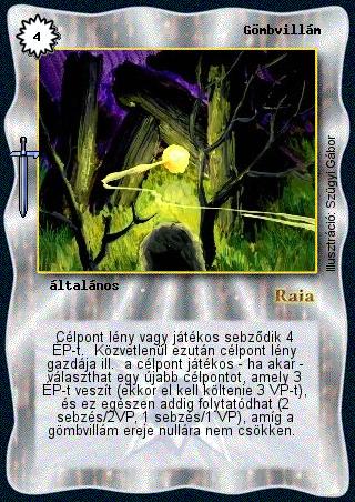 Kiadás: Alappakli, 3. kiadás, Hőskorszak, Védnök 2021, Túlélők Földje Gyakoriság: ritka Lapszín (isten): Raia Típus: általános Szöveg: Célpont lény vagy játékos sebződik 4 ÉP-t. Közvetlenül ezután célpont lény gazdája ill. a célpont játékos - ha akar - választhat egy újabb célpontot, amely 3 ÉP-t veszít (ekkor el kell költenie 3 VP-t), és ez egészen addig folytatódhat (2 sebzés/2VP, 1 sebzés/1 VP), amíg a gömbvillám ereje nullára nem csökken. Illusztráció: