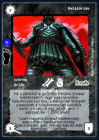 Kiadás: Óriások földje (Invázió) Gyakoriság: ritka Lapszín (isten): Leah Típus: szörny Altípus: óriás Szöveg: Ha a játékból a gyűjtőbe kerülne (kivéve feláldozástól) vagy visszakerülne tulajdonosa kezébe, a halálóriás ehelyett passzívan a tulajdonosa tartalékjába kerül, és rakj rá egy jelzőt, ami -1 sebzést és -1 ÉP-t jelent. Szinesítő szöveg: "Leah mágikus óriásait képtelenség elpusztítani: halálukkor mindig újjászületnek, igaz, mindig más és más formában." - Fairlight Illusztráció:
