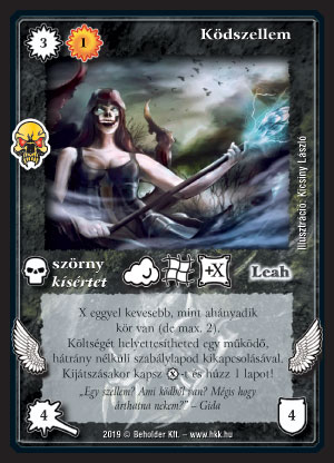 Kiadás: Élőholt invázió Gyakoriság: ritka Lapszín (isten): Leah Típus: szörny Altípus: kísértet Szöveg: X eggyel kevesebb, mint ahányadik kör van (de max. 2). Költségét helyettesítheted egy működő, hátrány nélküli szabálylapod kikapcsolásával. Kijátszásakor kapsz X_VP-t és húzz 1 lapot! Szinesítő szöveg: "Egy szellem? Ami ködből van? Mégis hogy árthatna nekem?" - Gida Illusztráció: Kicsiny László