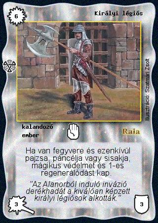 Kiadás: Isteni szövetség, Túlélők Földje Gyakoriság: nem gyakori Lapszín (isten): Raia Típus: kalandozó Altípus: ember Szöveg: Ha van fegyvere és ezenkívül pajzsa, páncélja vagy sisakja, mágikus védelmet és 1-es regenerálódást kap. Szinesítő szöveg: "Az Alanorból induló invázió derékhadát a kiválóan képzett királyi légiósok alkották." Illusztráció: Szatmári Zsolt