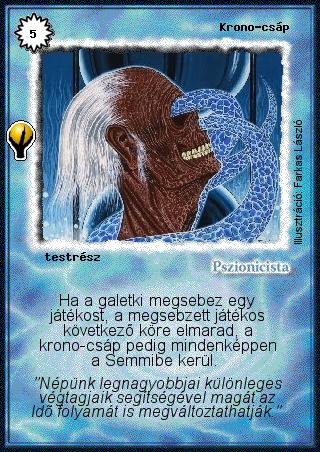 Kiadás: Alappakli, 5. kiadás (Ősök városa), Alappakli, 6. kiadás (Ősök Városa), Alappakli, 7. kiadás (Ősök Városa) Gyakoriság: ritka Lapszín (isten): Pszionicista Klán Típus: testrész Szöveg: Ha a galetki megsebez egy játékost, a megsebzett játékos következő köre elmarad, a krono-csáp pedig mindenképpen a Semmibe kerül. Szinesítő szöveg: "Népünk legnagyobbjai különleges végtagjaik segítségével magát az Idő folyamát is megváltoztathatják." Illusztráció: Farkas László