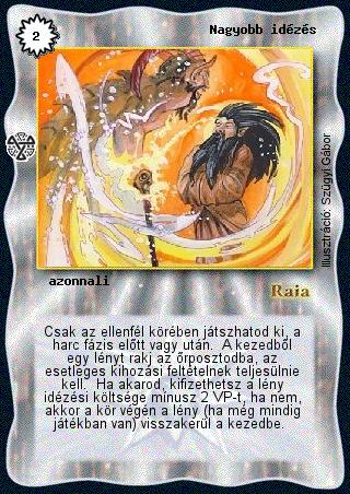 Kiadás: Isteni szövetség Gyakoriság: gyakori Lapszín (isten): Raia Típus: azonnali Szöveg: Csak az ellenfél körében játszhatod ki, a harc fázis előtt vagy után. A kezedből egy lényt rakj az őrposztodba, az esetleges kihozási feltételnek teljesülnie kell. Ha akarod, kifizethetsz a lény idézési költsége mínusz 2 VP-t, ha nem, akkor a kör végén a lény (ha még mindig játékban van) visszakerül a kezedbe. Illusztráció: