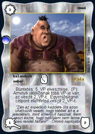 Kiadás: Árnyékhold, Túlélők Földje Gyakoriság: nem gyakori Lapszín (isten): Raia Típus: kalandozó Altípus: ember Szöveg: Büntetés: 5 VP elvesztése. (P): Amelyik játékosnak több VP-je van, az veszít 2 VP-t. Egyenlőségnél célpont ellenfeled veszít 2 VP-t. Szinesítő szöveg: "Zén az expedíció kezdete óta azon vitatkozik velem, hogy többet árt-e a jelenlétem, mint amennyit használ. Nem veszi észre, hogy nélkülem nem lenne képes rendet tartani!" - Ommó naplójából Illusztráció: Szász Gábor