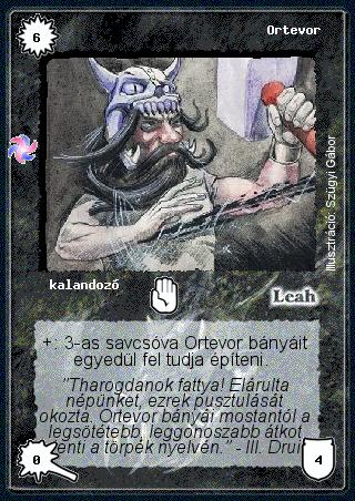 Kiadás: Létsíkok, Védnök 2025 Gyakoriság: ritka Lapszín (isten): Leah Típus: kalandozó Szöveg: +: 3-as savcsóva Ortevor bányáit egyedül fel tudja építeni. Szinesítő szöveg: "Tharogdanok fattya! Elárulta népünket, ezrek pusztulását okozta. Ortevor bányái mostantól a legsötétebb, leggonoszabb átkot jelenti a törpék nyelvén." - III. Druin Illusztráció: