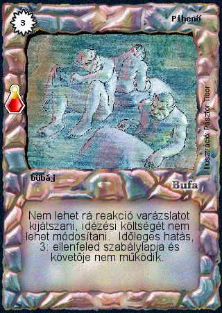 Kiadás: Esthar Császárság Gyakoriság: ritka Lapszín (isten): Bufa Típus: bűbáj Szöveg: Nem lehet rá reakció varázslatot kijátszani, idézési költségét nem lehet módosítani. Időleges hatás, 3: ellenfeled szabálylapja és követője nem működik. Illusztráció: Pásztor Tibor