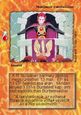 Kiadás: Esthar Császárság Gyakoriság: nem gyakori Lapszín (isten): Nincs Típus: követő Szöveg: A fő fázisában bármely játékos megszüntetheti 13 max. ÉP és 13 ÉP feláldozása árán. Minden lényed 3 ÉP-s Büntetést kap, ami összeadódik más Büntetésekkel. Szinesítő szöveg: "A rakshallionok, az estharok főpapjai egyszerre voltak vezetők, és a nép védelmezői." Illusztráció: