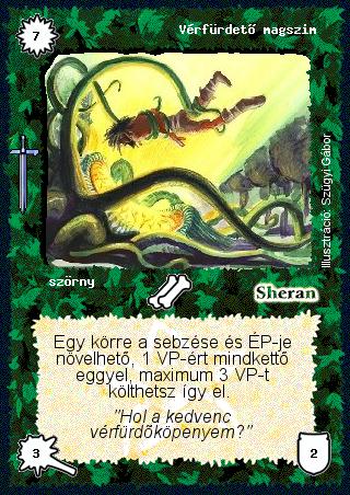 Kiadás: Alappakli, 2. kiadás, Alappakli, 3. kiadás, Hőskorszak Gyakoriság: nem gyakori Lapszín (isten): Sheran Típus: szörny Szöveg: Egy körre a sebzése és ÉP-je növelhető, 1 VP-ért mindkettő eggyel, maximum 3 VP-t költhetsz így el. Szinesítő szöveg: "Hol a kedvenc vérfürdőköpenyem?" Illusztráció: