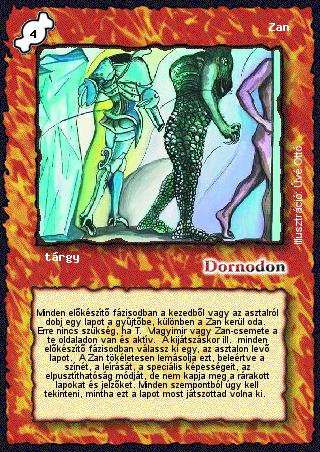 Kiadás: Alappakli, 1. kiadás, Védnök 2021 Gyakoriság: ritka Lapszín (isten): Dornodon Típus: tárgy Szöveg: Minden előkészítő fázisodban a kezedből vagy az asztalról dobj egy lapot a gyűjtőbe, különben a Zan kerül oda. Erre nincs szükség, ha T. Vlagyimir vagy Zan-csemete a te oldaladon van és aktív. A kijátszáskor ill. minden előkészítő fázisodban válassz ki egy, az asztalon levő lapot. A Zan tökéletesen lemásolja ezt, beleértve a színét, a leírását, a speciális képességeit, az elpusztíthatóság módját, de nem kapja meg a rárakott lapokat és jelzőket. Minden szempontból úgy kell tekinteni, mintha ezt a lapot most játszottad volna ki. Illusztráció: Úvé Ottó