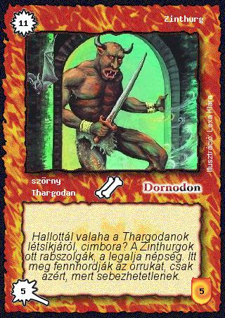 Kiadás: Alappakli, 1. kiadás, Alappakli, 2. kiadás, Alappakli, 3. kiadás, Alappakli, 4. kiadás Gyakoriság: ritka Lapszín (isten): Dornodon Típus: szörny Altípus: Thargodan Szinesítő szöveg: Hallottál valaha a Thargodanok létsíkjáról, cimbora? A Zinthurgok ott rabszolgák, a legalja népség. Itt meg fennhordják az orrukat, csak azért, mert sebezhetetlenek. Illusztráció: Lexa Klára