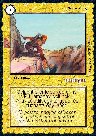 Kiadás: Alanori Krónika Gyakoriság: ritka Lapszín (isten): Fairlight Típus: azonnali Szöveg: Célpont ellenfeled kap annyi VP-t, amennyi volt neki. Aktivizálódik egy tárgyad, és húzhatsz egy lapot. Szinesítő szöveg: "Ó persze, nagyon szívesen segítek! De ne felejtsük el: mostantól tartozol nekem." Illusztráció: Varga András