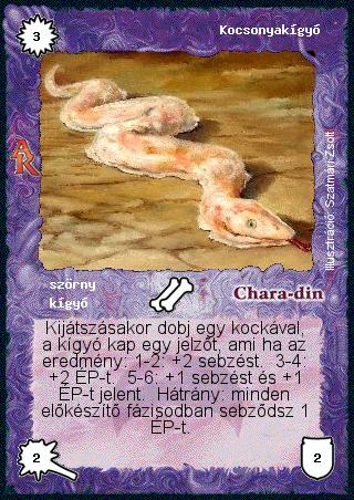 Kiadás: Alanori Krónika Gyakoriság: ritka Lapszín (isten): Chara-din Típus: szörny Altípus: kígyó Szöveg: Kijátszásakor dobj egy kockával, a kígyó kap egy jelzőt, ami ha az eredmény: 1-2: +2 sebzést. 3-4: +2 ÉP-t. 5-6: +1 sebzést és +1 ÉP-t jelent. Hátrány: minden előkészítő fázisodban sebződsz 1 ÉP-t. Illusztráció: Szatmári Zsolt